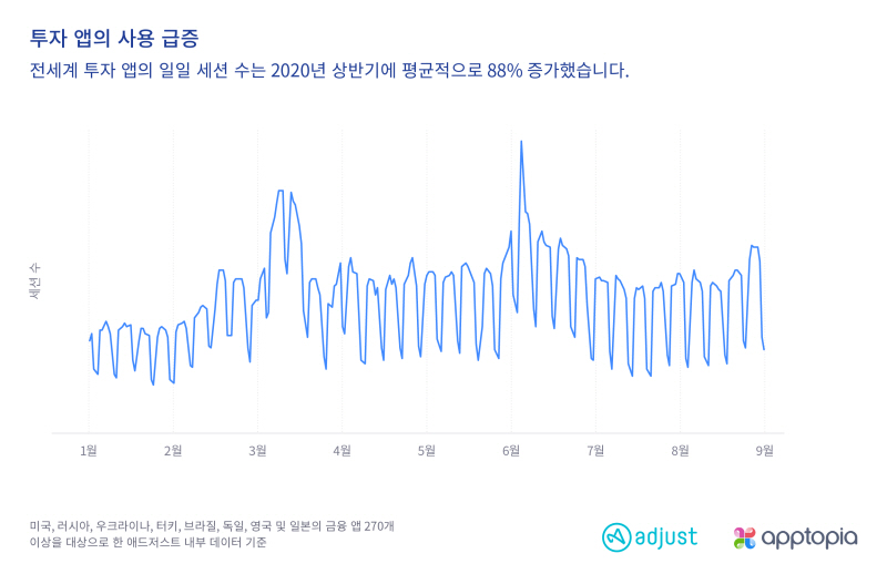 애드저스트의 데이터에 따르면 핀테크 앱 사용 시간은 전세계에 락다운(Lockdown)이 시행된 올해 2분기 가장 많이 증가했다. 전년도 대비 올해 앱 이용 시간이 가장 많이 늘어난 국가는 아르헨티나(72%)였으며, 우크라이나(62%)가 그 뒤를 이었다. 또한, 러시아와 브라질도 약 50% 증가했으며, 일본은 21%의 성장률을 보였다.