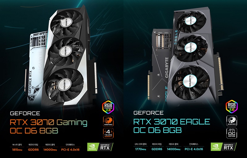 GIGABYTE Technology Co., LTD (이하 기가바이트)의 공식 공급원인 제이씨현시스템㈜ (대표: 차현배)는 2020년 10월 29일(목), 성능과 가격으로 시장을 선도할 신제품 GIGABYTE 지포스 RTX 3070 GAMING, EAGLE 그래픽카드를 공식 출시했다.