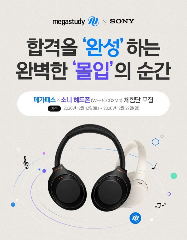 소니코리아가 온라인 교육 서비스 매가스터디와 함께 수험생을 위한 ‘합격을 완성하는 몰입의 순간’ 콘텐츠 결합 체험단을 모집한다. 체험 콘텐츠는 업계 최고 수준의 무선 노이즈 캔슬링 헤드폰 WH-1000XM4와 메가스터디 대표 콘텐츠 ‘메가패스’다.