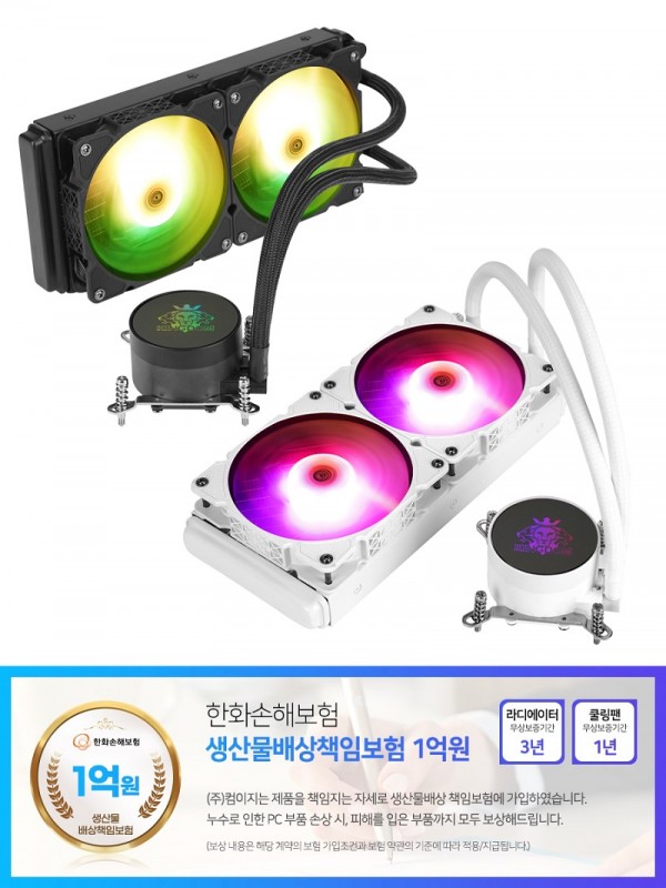 컴이지, comez, 2열 수냉쿨러, 킹덤, Kingdom, THEC1-SGW 240 ARGB, 생산물배상 책임보험, 가입, 라디에이터, 3년, 쿨링팬, 1년, 무상보증