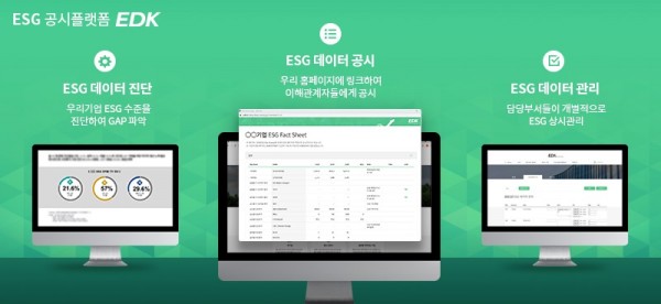 EDK는 기업별 ESG 현 수준 진단 후 평가대상 등 경영환경에 따른 ESG 공개 지표를 결정해 기업별 공시 플랫폼을 생성함으로써 직접 정량정성 데이터를 입력할 수 있다. 또한, 기존에 홈페이지 등에 공개 중인 정책, 문서 등을 링크해 ESG 공시 채널을 일원화하는 장점이 있다. 데이터 입력이 완료되면 EDK 링크 사이트를 생성해 기업별 홈페이지에 링크할 수 있으며 기업 이해관계자들은 EDK 사이트가 아닌 기업 홈페이지에서 ESG 정보를 확인할 수 있다. EDK는 단일 플랫폼에서 기업 ESG 정보를 관리하면서 동시에 최종 정보사용자의 접근성을 높이는데 중점을 두고 있다.