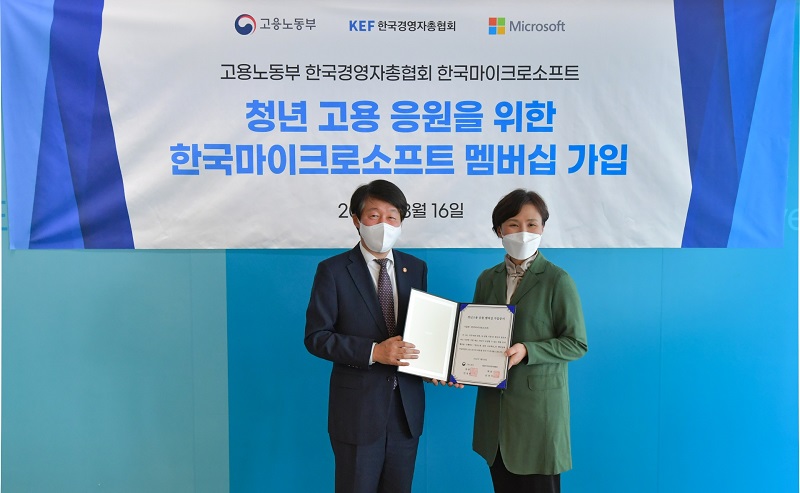 한국마이크로소프트가 16일 고용노동부가 추진하는 ‘청년고용 응원 프로젝트’ 멤버십 15번째 기업으로 가입, 청년 인재 양성을 위한 ICT기술교육 프로그램을 개설한다.