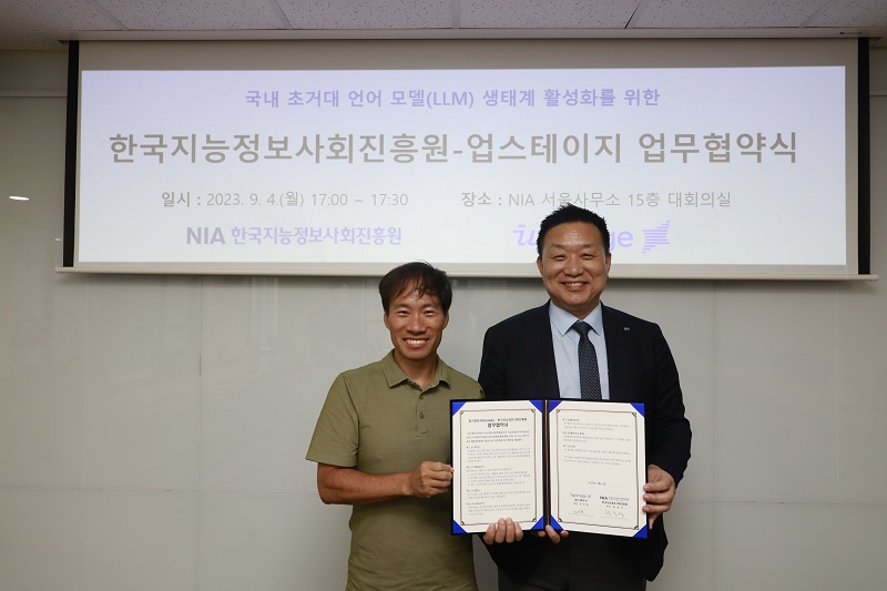 국내 AI 스타트업 업스테이지(대표 김성훈)가 5일 한국지능정보사회진흥원(이하 NIA)과 한국형 Open LLM 리더보드를 구축하기 위해 ‘AI Hub 데이터 활용 업무협약’을 체결했다고 밝혔다. 양사는 광화문 NIA 서울사무실에서 업스테이지 김성훈 대표와 NIA 황종성 원장 등 주요 경영진이 참석한 가운데 협약식을 진행했다.