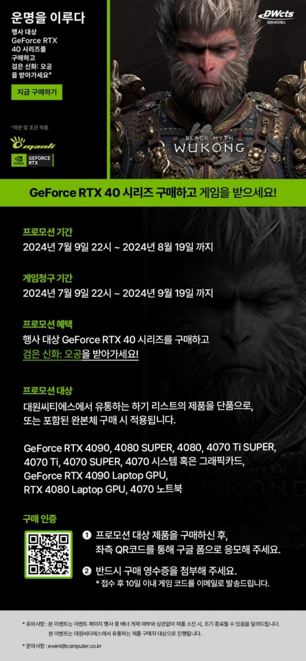 대원씨티에스, dwcts, 액션 어드벤처, 신작, 액션 RPG, 검은 신화: 오공, 게임 번들, 프로모션, 엔비디아, NVIDIA, 지포스 RTX 40 시리즈, 만리, Manli, 한국 시장 유통, 제품