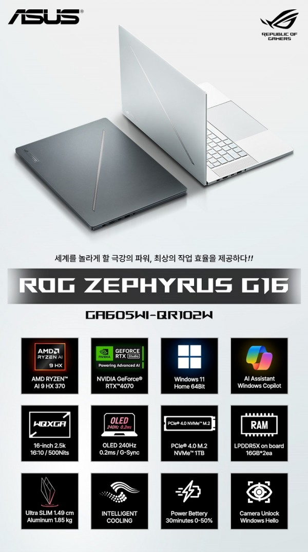 아이티블루, ASUS, 공식 유통 채널, AMD, 라이젠 AI, Ryzen AI, 최신, CPU, ROG 제피러스 G16, Zephrus G16, 화이트, 색상, 출시