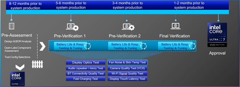 각 시스템 설계는 먼저 사전 평가를 통과한 후, 6개월에 걸쳐 10가지 다른 테스트 기준을 통과해야 한다. 이 기간 동안 시스템은 인텔 이보 기준에 맞게 조정된다. 모든 테스트가 완료되고 최종 검증이 이루어진 후에야 해당 시스템 설계는 인텔 에보 에디션 노트북으로 인증받아 배지를 부착하게 된다.