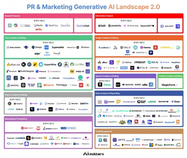 이번 업데이트는 지난 3월에 공개된 1.0 버전에서 약 3배 규모로 확대되었으며, PR과 마케팅 분야 전문가들에게 실질적인 도움을 줄 수 있는 생성형 AI 툴들을 선별하여 소개하고 있다.
