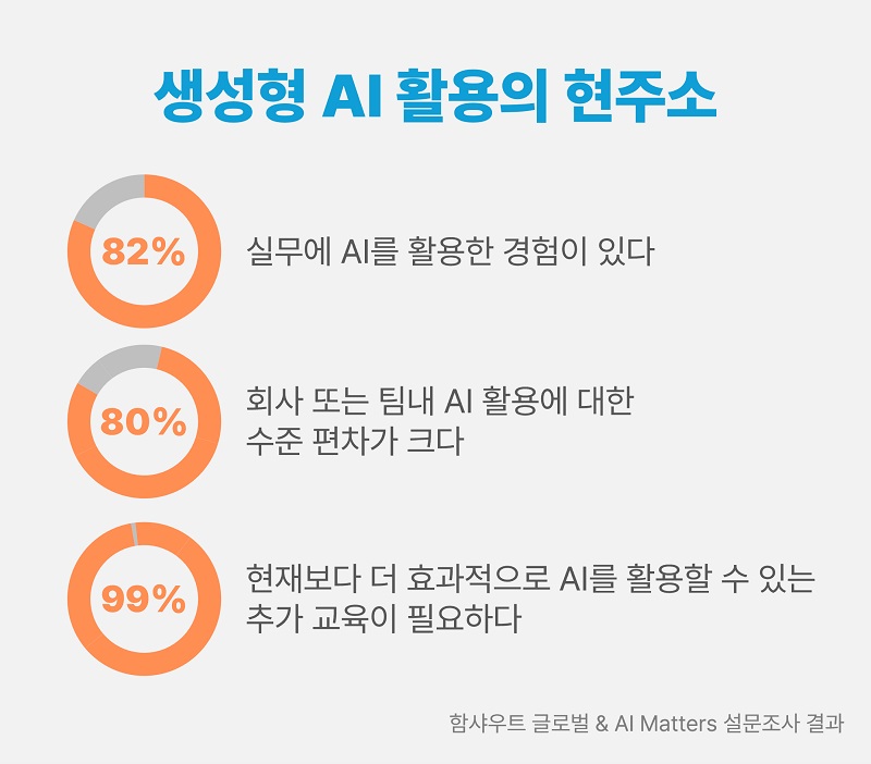 함샤우트 글로벌, 82%, 실무, 생성형 AI, 활용 경험, 99%, 추가 교육 필요, 기업 대상, AI 교육 관련, 설문조사, 결과, 발표