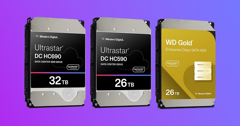 WD 32TB 울트라스타 DC HC690 SMR HDD(좌)/ 26TB 울트라스타 DC HC590 CMR HDD(중)/ 26TB WD 골드 SATA HDD(우)