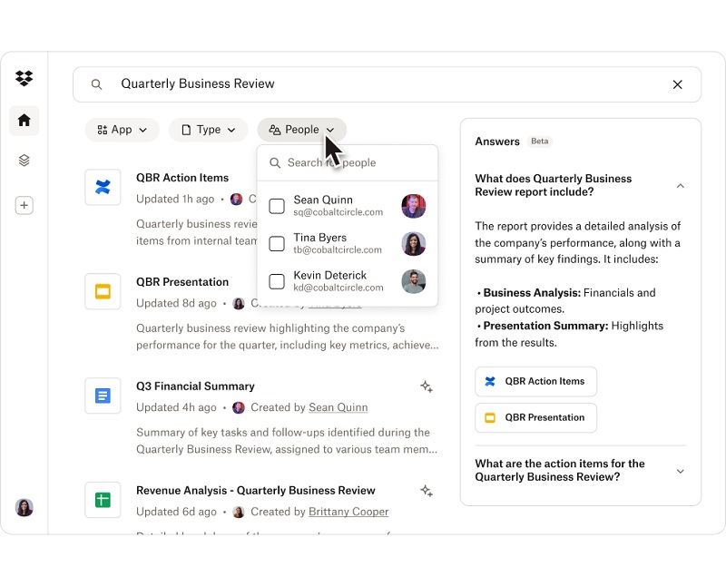 비즈니스용 드롭박스 대시에 집중력 분산을 줄이기 위한 새로운 기능들이 추가됐다. 드롭박스 대시는 크롬 또는 엣지의 시작 페이지를 통해 단일 대시보드를 제공한다. 기존의 범용 검색, 최근 작업 바로 가기, 회의 시작에 이어 한 번에 문서 업데이트 내용을 추적하는 ‘활동 피드(Activity Feed)’ 기능이 추가됐다. 또한 다양한 유형의 콘텐츠의 정리를 지원하는 스마트 컬렉션, ‘스택(Stack)’을 조직 또는 기업 차원에서 생성하고, 심층 공유 권한을 통해 내외부와 공유할 수 있게 됐다. AI를 기반으로 사용자의 질문에 답변하는 기능은 검색어를 기반으로 후속 질문, 답변 및 관련 콘텐츠 링크를 제공함으로써 더 깊이 있는 인사이트를 제공한다.