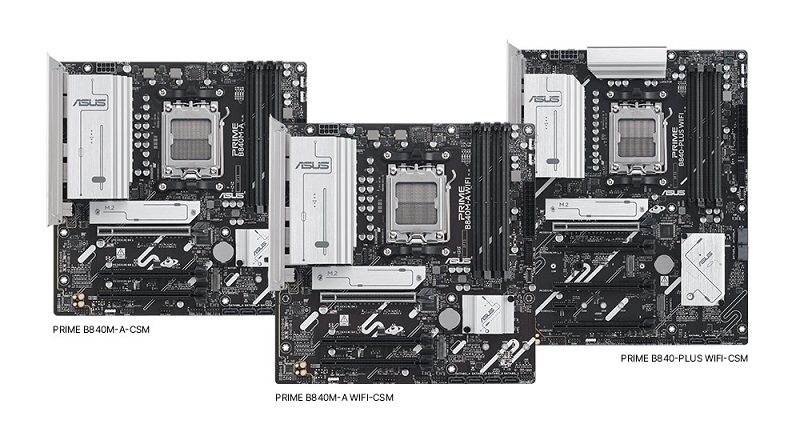 B840 시리즈는 M-ATX 규격으로 제작된 PRIME B840M-A-CSM과 B840M-A WIFI-CSM, 그리고 ATX 규격의 PRIME B840-PLUS WIFI-CSM 총 3가지 모델로 출시된다. 엔트리 등급에서도 ATX 규격의 옵션을 제공하여 높은 등급의 그래픽카드를 구성하거나 여러 확장 카드를 동시에 장착할 수도 있다.