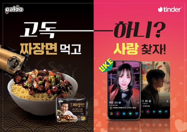 틴더, tinder, 글로벌, 소셜 매칭 앱, 캠퍼스에서, 같이, 짜장면, 먹고, 사랑 찾자!, 블랙데이, 맞아, 팔도, paldo, 와, 협업, 진행