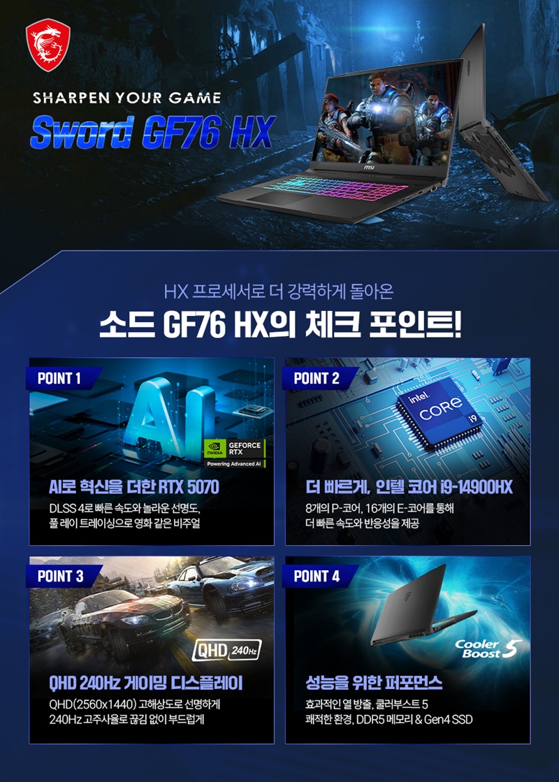 함께 출시된 소드 GF76 HX 시리즈는 엔비디아 블랙웰 기반 지포스 RTX 50 시리즈 그래픽을 탑재해, GDDR7 메모리와 DLSS 4 기술로 한층 더 정교해진 고품질 그래픽을 구현한다.