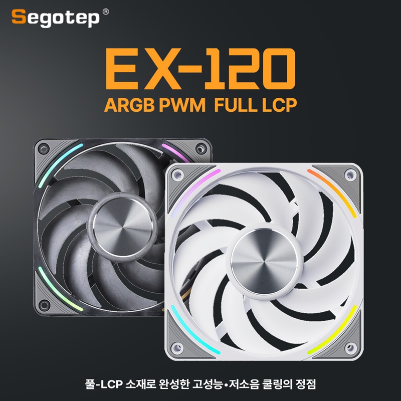 성능을 가장 중요시하는 PC 애호가들을 위해 출시된 ‘EX120 ARGB PWM FULL LCP’ 쿨링팬'은 세고텝의 전문 엔지니어링과 디자인 기술을 통해 액정 폴리머(LCP-Liquid Crystal Polymer)로 바디를 구성하여 성능을 극대화했다.