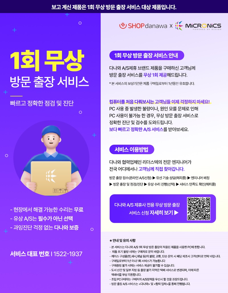 1회 무상 방문 출장 서비스는 PC 사용에 익숙하지 않은 초보자부터, 예기치 못한 불량으로 사용이 어려운 고객까지 누구나 안심하고 이용할 수 있도록 마련됐다. 해당 서비스는 마이크로닉스 PC 케이스 및 PC 케이스가 포함된 완제 PC를 샵다나와에서 구매시 제공되며, 1년간 1회 무상으로 서비스를 제공받을 수 있다.