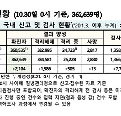 코로나19 국내 확진환자 총 362639명 및 격리해제 334581명·사망 2830명, 10월 30일 0시 기준 2104명 추가 확인