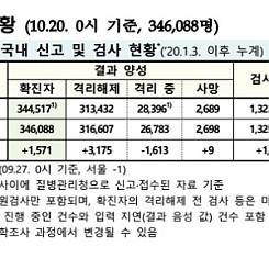 코로나19 국내 확진환자 총 346088명 및 격리해제 316607명·사망 2698명, 10월 20일 0시 기준 1571명 추가 확인