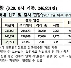 코로나19 국내 확진환자 총 246951명 및 격리해제 216989명·사망 2276명, 8월 28일 0시 기준 1793명 추가 확인