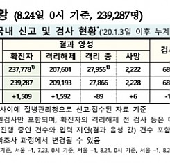 코로나19 국내 확진환자 총 239287명 및 격리해제 209193명·사망 2228명, 8월 24일 0시 기준 1509명 추가 확인
