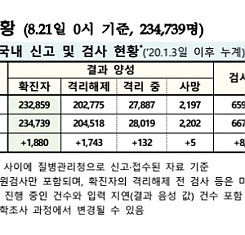 코로나19 국내 확진환자 총 234739명 및 격리해제 204518명·사망 2202명, 8월 21일 0시 기준 1880명 추가 확인