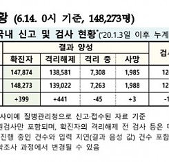 코로나19 국내 확진환자 총 148273명 및 격리해제 139022명·사망 1988명, 6월 14일 0시 기준 399명 추가 확인