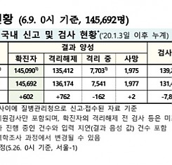 코로나19 국내 확진환자 총 145692명 및 격리해제 136174명·사망 1977명, 6월 9일 0시 기준 602명 추가 확인