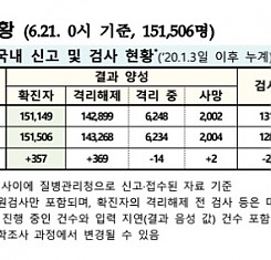 코로나19 국내 확진환자 총 151506명 및 격리해제 143268명·사망 2004명, 6월 21일 0시 기준 357명 추가 확인