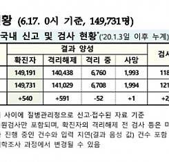 코로나19 국내 확진환자 총 149731명 및 격리해제 141029명·사망 1994명, 6월 17일 0시 기준 540명 추가 확인