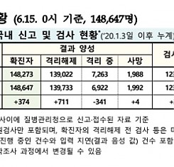 코로나19 국내 확진환자 총 148273명 및 격리해제 139022명·사망 1992명, 6월 15일 0시 기준 374명 추가 확인