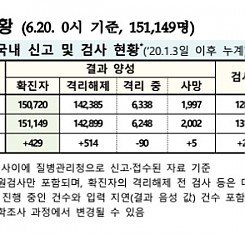 코로나19 국내 확진환자 총 151149명 및 격리해제 142899명·사망 2002명, 6월 20일 0시 기준 429명 추가 확인
