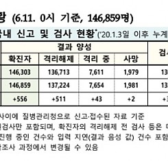 코로나19 국내 확진환자 총 146859명 및 격리해제 137224명·사망 1981명, 6월 11일 0시 기준 556명 추가 확인