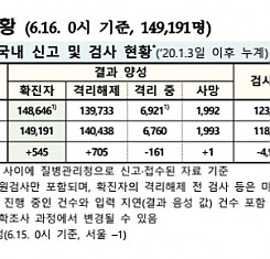 코로나19 국내 확진환자 총 149191명 및 격리해제 140438명·사망 1993명, 6월 16일 0시 기준 545명 추가 확인