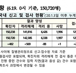코로나19 국내 확진환자 총 150720명 및 격리해제 142385명·사망 1997명, 6월 19일 0시 기준 482명 추가 확인