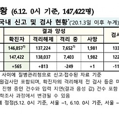 코로나19 국내 확진환자 총 147422명 및 격리해제 138037명·사망 1982명, 6월 12일 0시 기준 565명 추가 확인