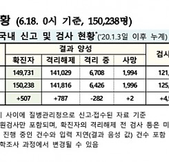 코로나19 국내 확진환자 총 150238명 및 격리해제 141816명·사망 1996명, 6월 18일 0시 기준 507명 추가 확인