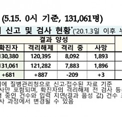코로나19 국내 확진환자 총 131061명 및 격리해제 121282명·사망 1896명, 5월 15일 0시 기준 681명 추가 확인