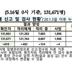 코로나19 국내 확진환자 총 131671명 및 격리해제 121764명·사망 1900명, 5월 16일 0시 기준 610명 추가 확인