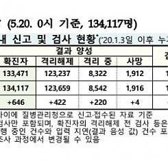 코로나19 국내 확진환자 총 134117명 및 격리해제 123659명·사망 1916명, 5월 20일 0시 기준 646명 추가 확인