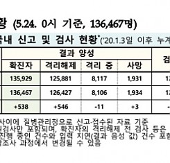 코로나19 국내 확진환자 총 136467명 및 격리해제 126427명·사망 1934명, 5월 24일 0시 기준 538명 추가 확인