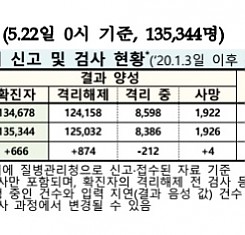코로나19 국내 확진환자 총 135344명 및 격리해제 125032명·사망 1926명, 5월 22일 0시 기준 666명 추가 확인