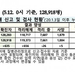 코로나19 국내 확진환자 총 128918명 및 격리해제 119373명·사망 1884명, 5월 12일 0시 기준 635명 추가 확인