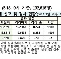 코로나19 국내 확진환자 총 132818명 및 격리해제 122631명·사망 1904명, 5월 18일 0시 기준 528명 추가 확인