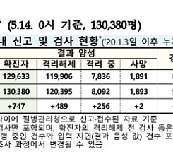 코로나19 국내 확진환자 총 130380명 및 격리해제 120395명·사망 1893명, 5월 14일 0시 기준 747명 추가 확인