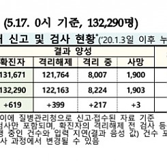 코로나19 국내 확진환자 총 132290명 및 격리해제 122163명·사망 1903명, 5월 17일 0시 기준 619명 추가 확인
