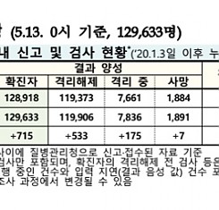코로나19 국내 확진환자 총 129633명 및 격리해제 119906명·사망 1891명, 5월 13일 0시 기준 715명 추가 확인