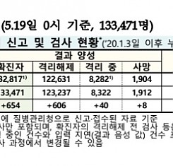 코로나19 국내 확진환자 총 133471명 및 격리해제 123237명·사망 1912명, 5월 19일 0시 기준 654명 추가 확인
