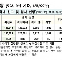 코로나19 국내 확진환자 총 135929명 및 격리해제 125881명·사망 1931명, 5월 23일 0시 기준 585명 추가 확인