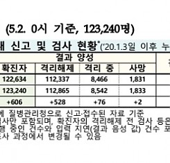 코로나19 국내 확진환자 총 123240명 및 격리해제 112865명·사망 1833명, 5월 2일 0시 기준 606명 추가 확인