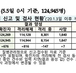 코로나19 국내 확진환자 총 124945명 및 격리해제 114944명·사망 1847명, 5월 5일 0시 기준 676명 추가 확인