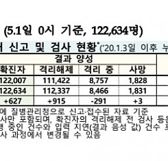 코로나19 국내 확진환자 총 122634명 및 격리해제 112337명·사망 1831명, 5월 1일 0시 기준 627명 추가 확인